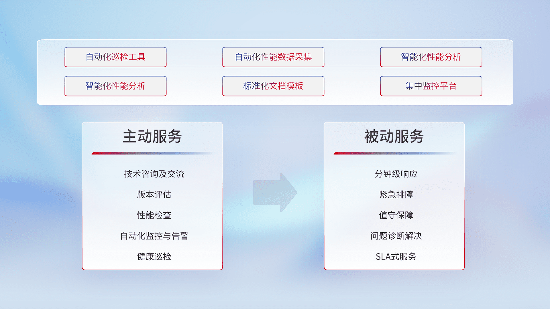 智能化工具和标准化文档,,,保障服务质量,,提供主动服务(包含技术咨询、、、、版本评估、、性能检查、、自动化监控与告警、、、、健康巡检)和被动服务包含(分钟级响应、、、紧急排障、、、值守保障、、、、问题诊断解决、、SLA服务)。。。